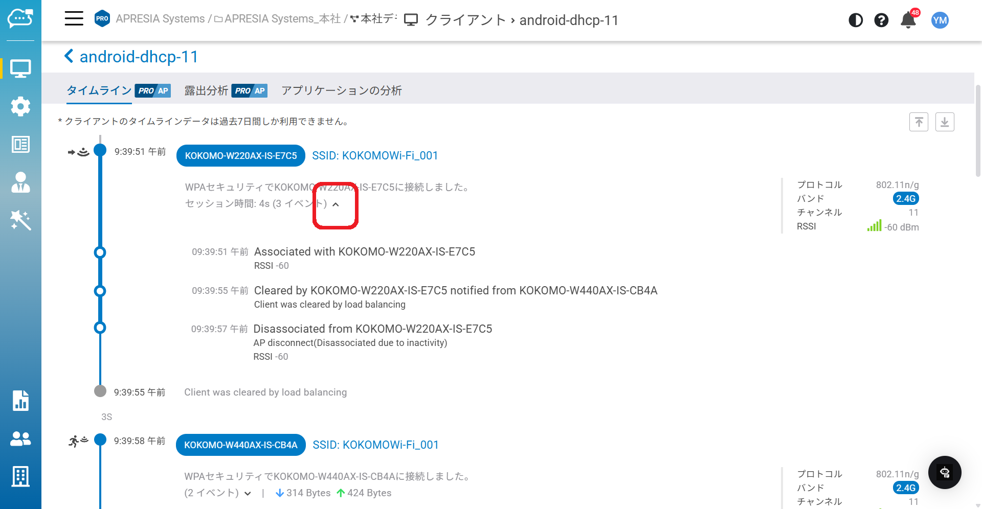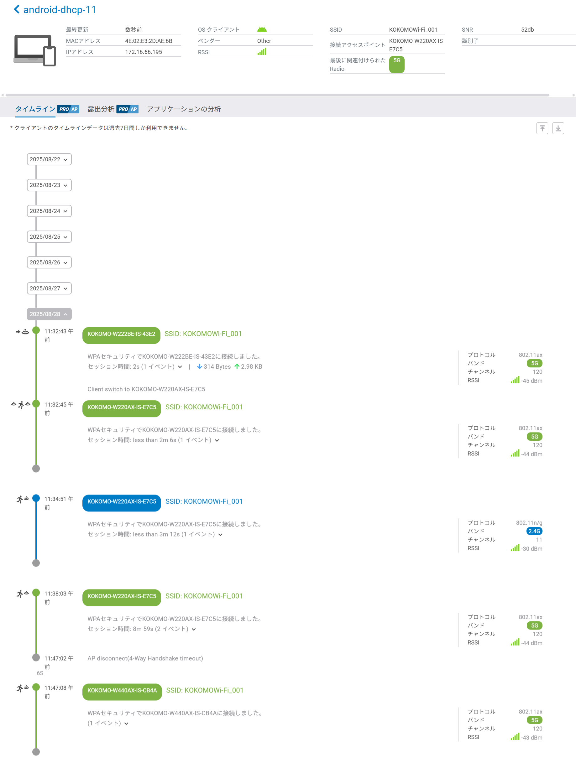 これらの状態はタイムラインの左側に表示され、クライアントがアクセスポイント間でどのように状態遷移したかを確認できます。
