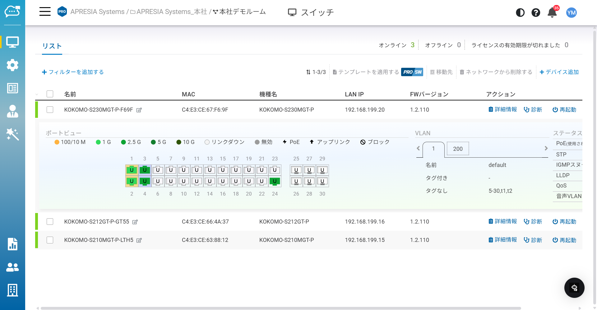スイッチリストのページには、組織/階層ビュー/ネットワーク内のすべてのスイッチが表示され、各スイッチを選択してポートのステータス、VLAN、STP、PoEを確認できます。