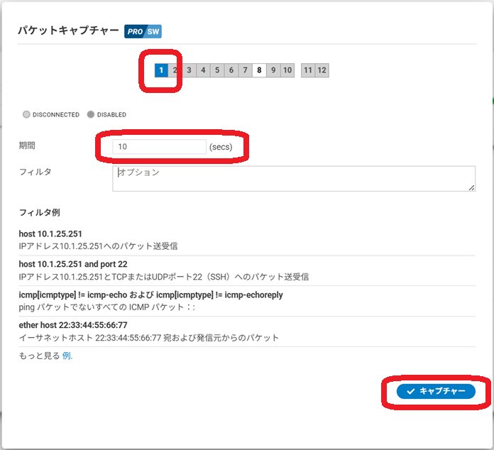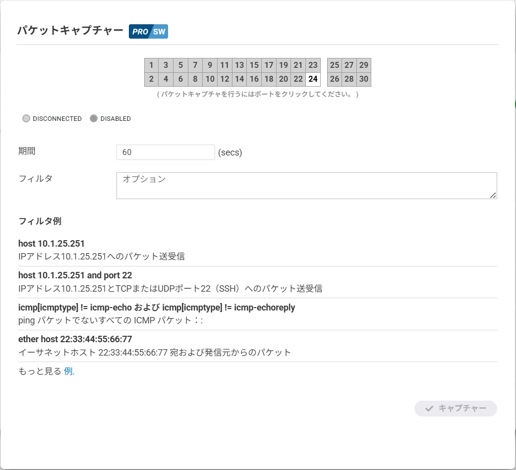 キャプチャー対象のポートを選択し、「期間」を秒数で入力して、「キャプチャー」をクリックします(必要に応じてフィルタを設定してください。フィルタはtcpdumpのフィルタに準じます)。 すると、スイッチがパケットを収集し、.pcapファイルとしてダウンロードします。