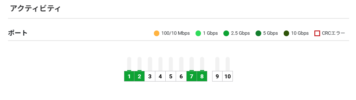 これは、ケーブル不良を含め、伝送に問題があるかどうかを示す重要な指標です。赤い四角はCRCエラーの検出を示します。ユーザーはポートにマウスオーバーすることで、スループットやCRCエラー数の詳細を確認できます。