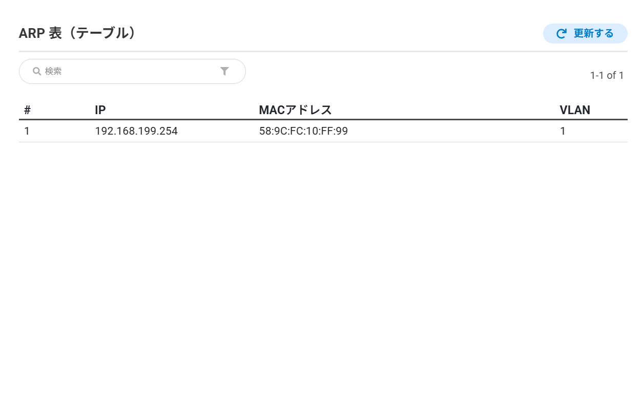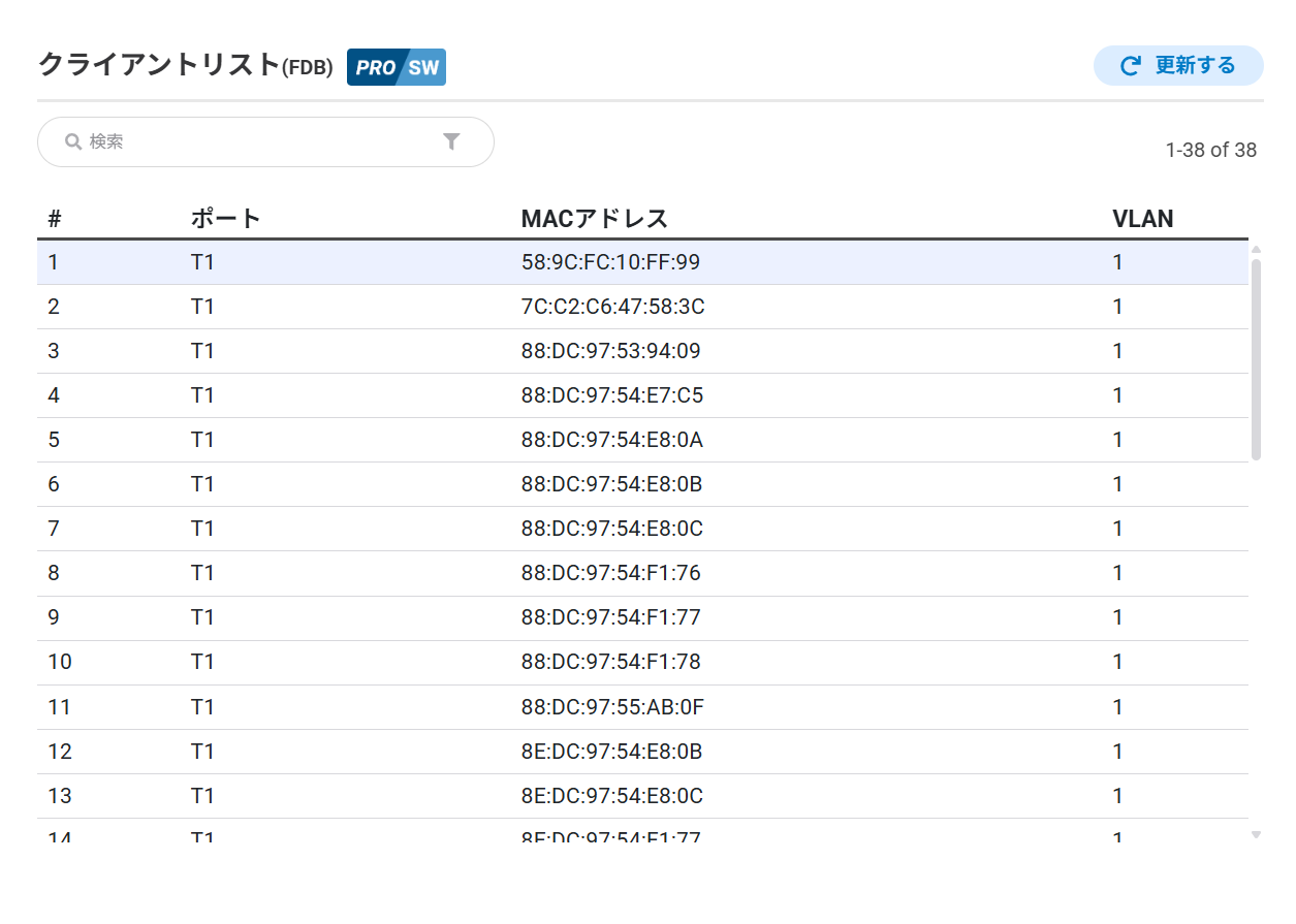 スイッチのリアルタイムのクライアントリストまたは転送テーブルの内容です。「更新する」ボタンをクリックしてテーブルを更新できます。