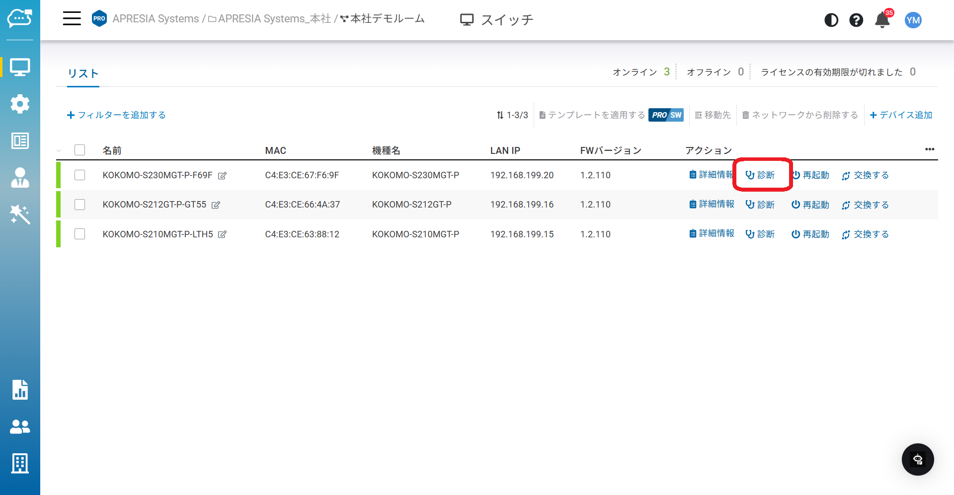 「管理」>「スイッチ」>「診断」からも起動できます。