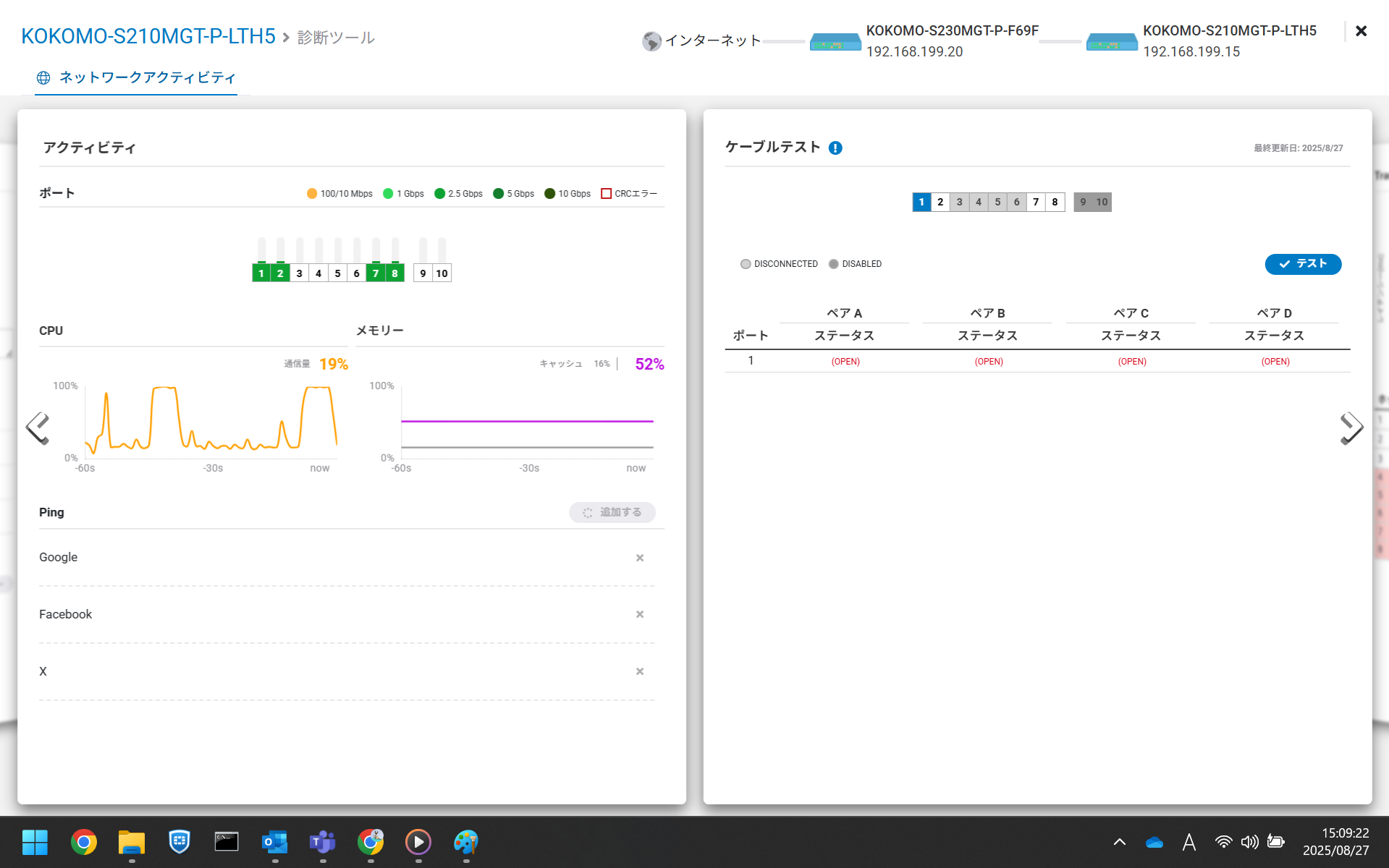 ケーブルテストでは、選択したポートのケーブルのステータスを確認でき(複数選択可)、断線箇所のおおよその距離も表示されます。