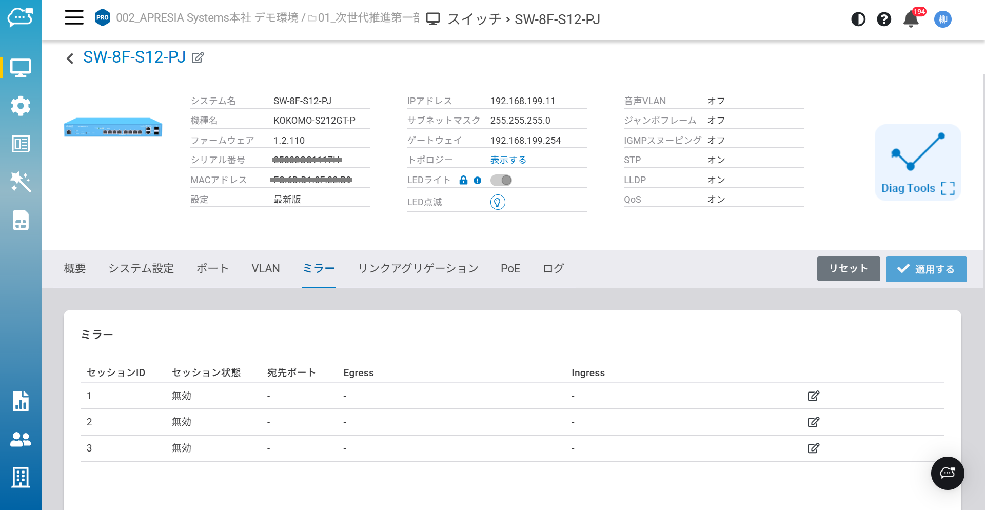 ポートミラーリングは、1つまたは複数のポートのパケットをミラーリング先ポートに複製する機能です。ミラーリング先ポートに監視用デバイスを接続することで、複製されたポートを通過するパケットの詳細を確認できます。ネットワークの監視やトラブルシューティングに有用です。この機能は「管理」>「スイッチ」>「詳細情報」>「ミラー」から利用できます。