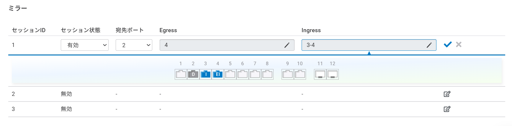 セッションID:ミラーリングセッションを識別する番号です。スイッチは最大3つのミラーリングセッションをサポートします。