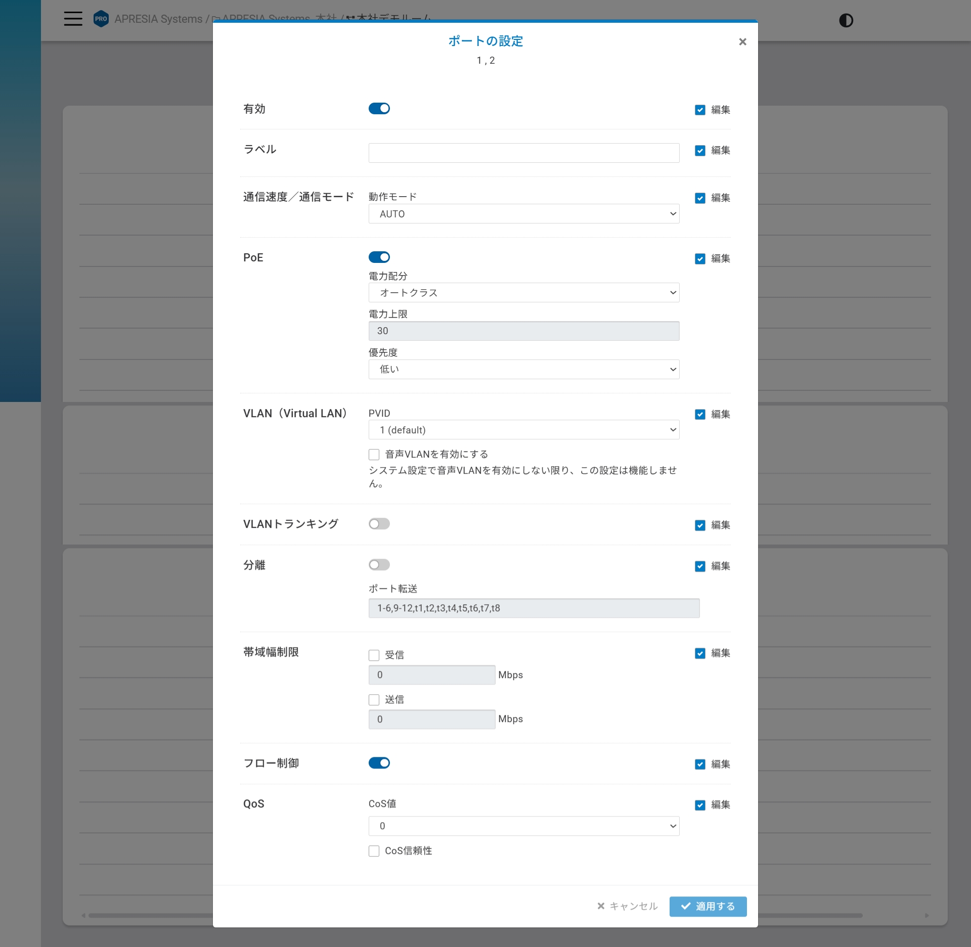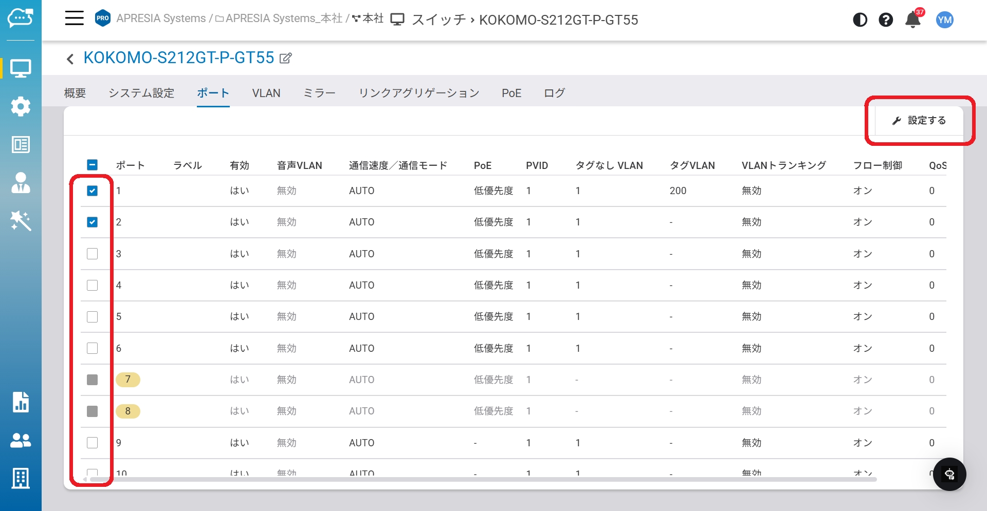 1つ以上のポートを選択し「設定」をクリックすると、以下の設定が表示されます。