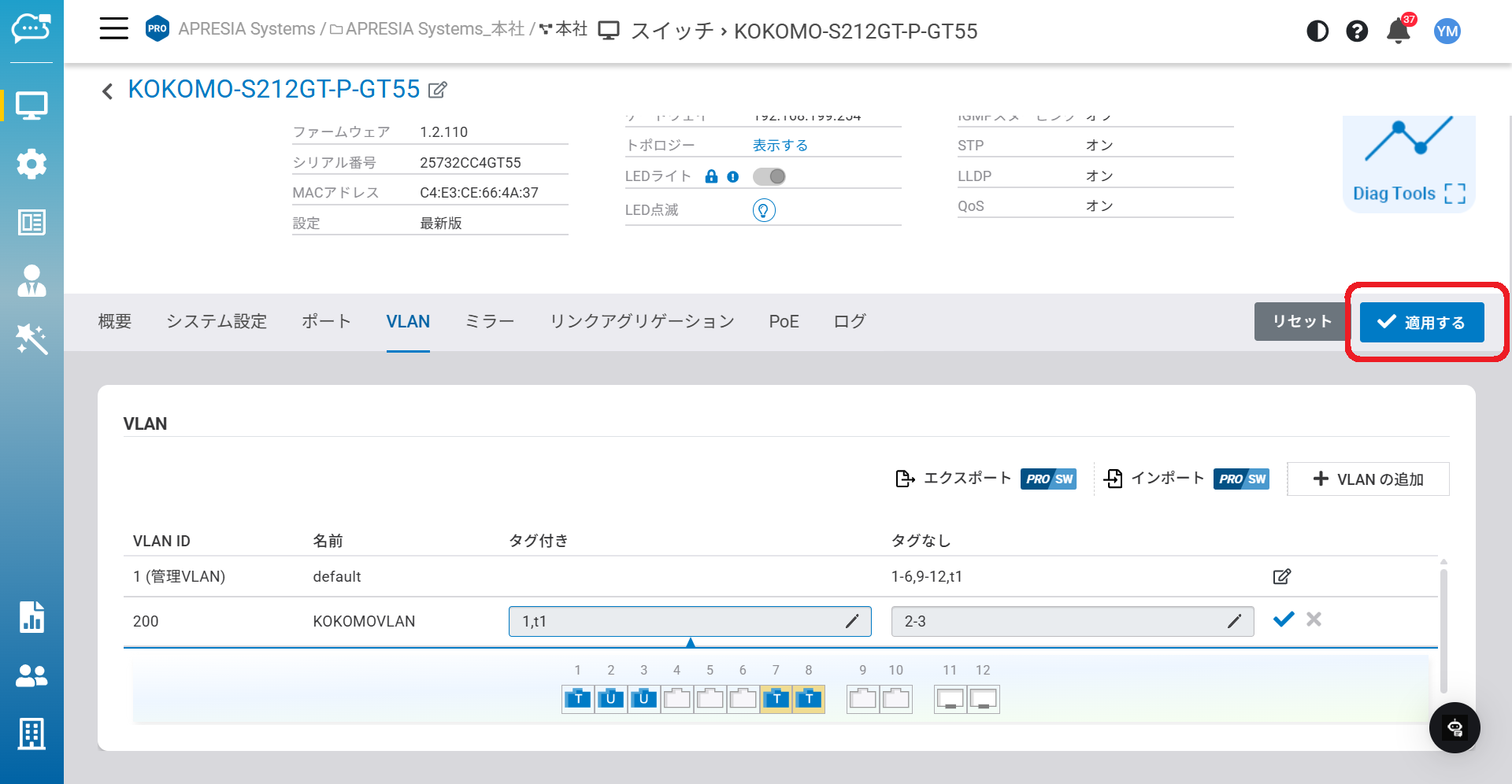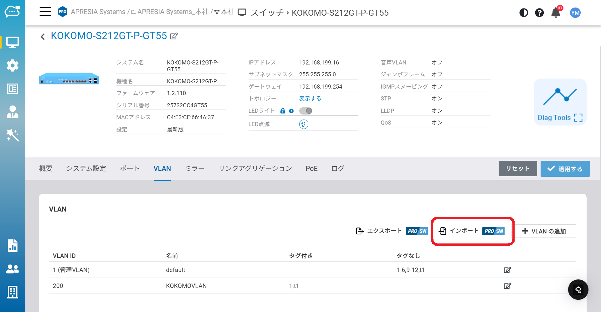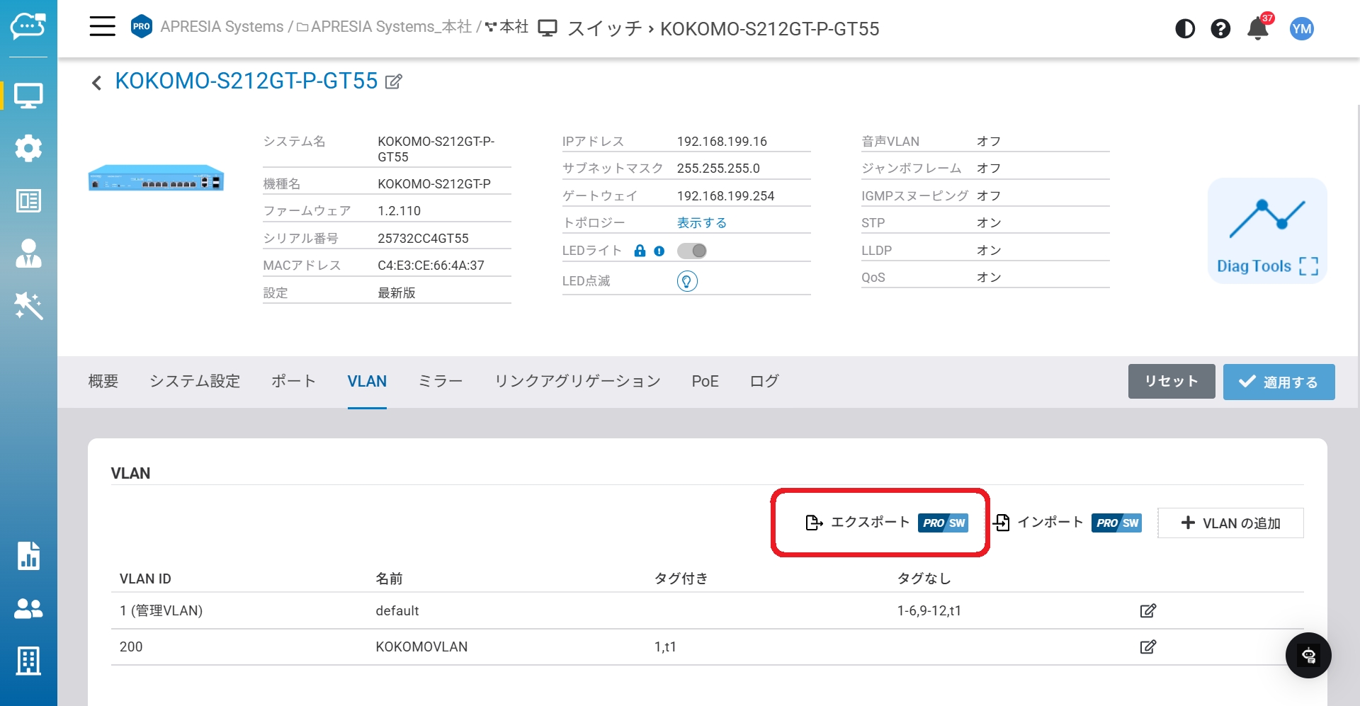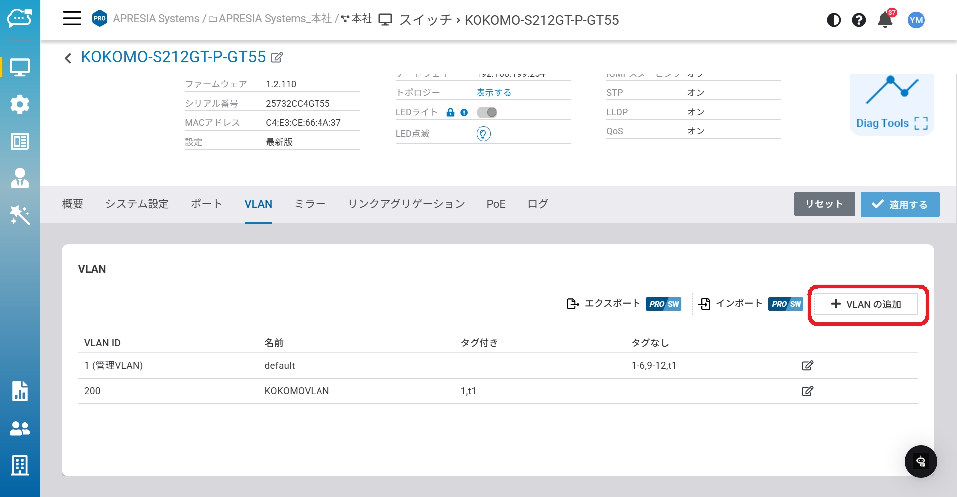 「管理」>「スイッチ」>「詳細情報」>「VLAN」からこのページにアクセスできます。