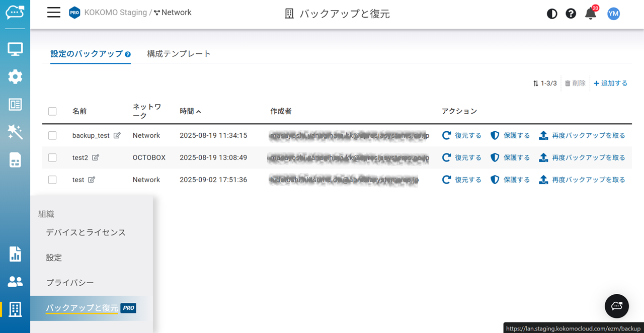 選択したネットワークのネットワーク全体の設定とデバイスのバックアップを作成し、それらを対応するネットワークやデバイスに復元できます。復元を行うと、すべてのネットワーク全体の設定およびデバイス設定は上書きされます。