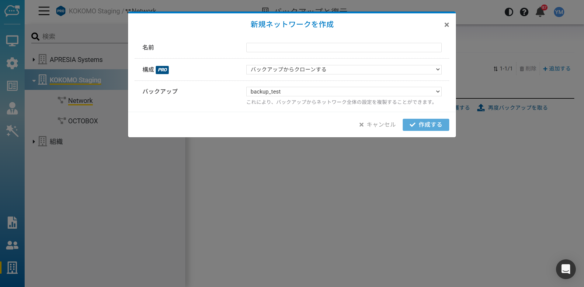ネットワークのクローンは同一組織内のバックアップ・構成テンプレートからのみ可能です。異なる組織のネットワークは選択できません。