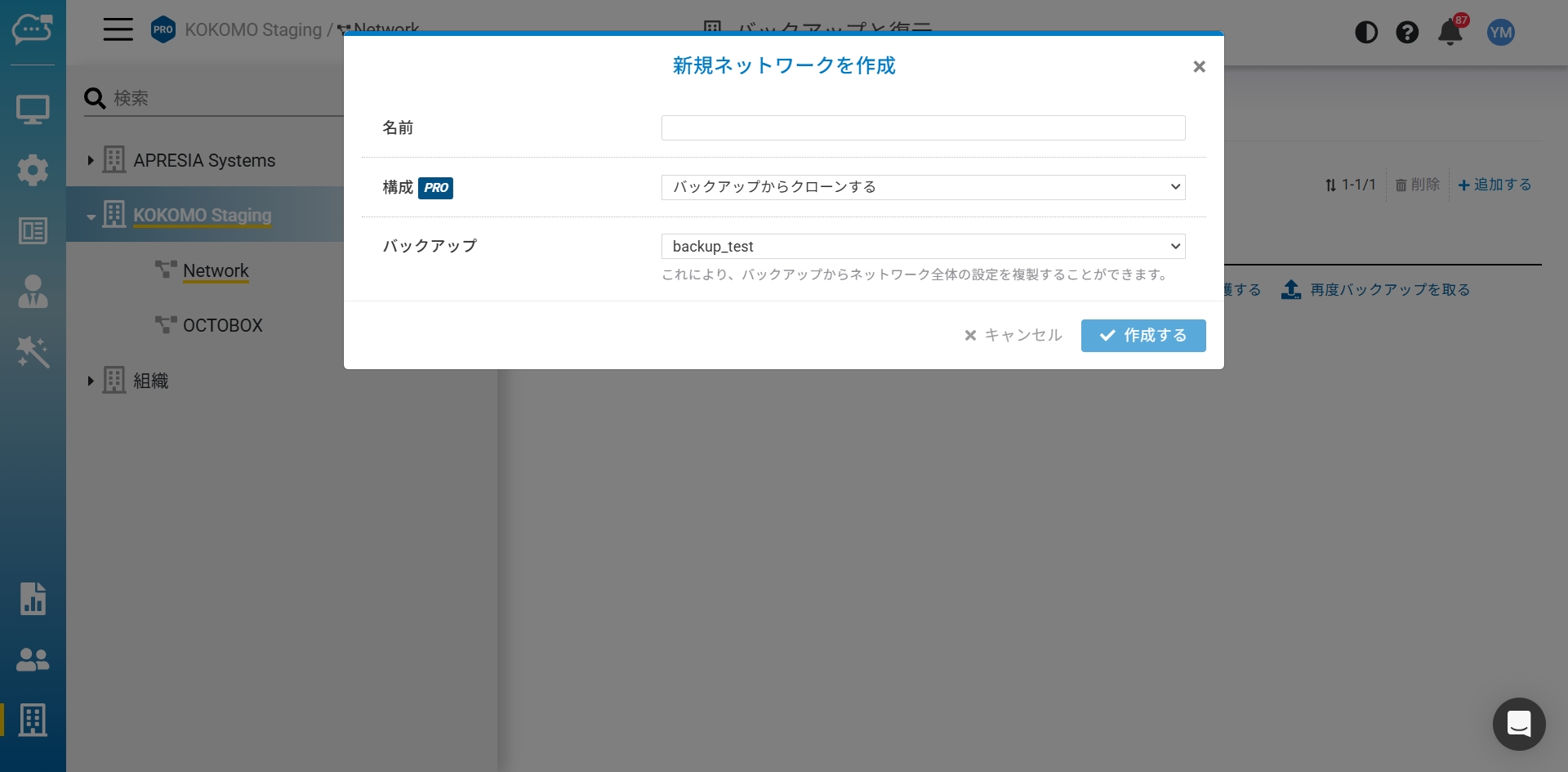 新しいネットワークの作成時に、別のネットワークの設定をクローンするオプションがあります。これにより、ローカルデバイス設定を除く、既存ネットワークからすべてのネットワーク全体設定がコピーされます。