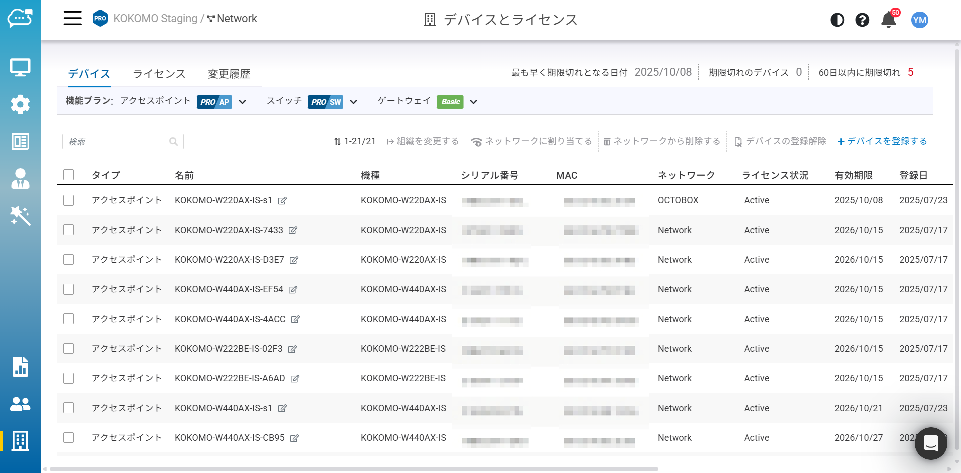 「デバイス」のページには、現在の組織内に存在するか、またはネットワークに追加されたすべてのデバイスが一覧表示されます。「デバイス」のページでは、各デバイスについて以下の情報が表示されます。