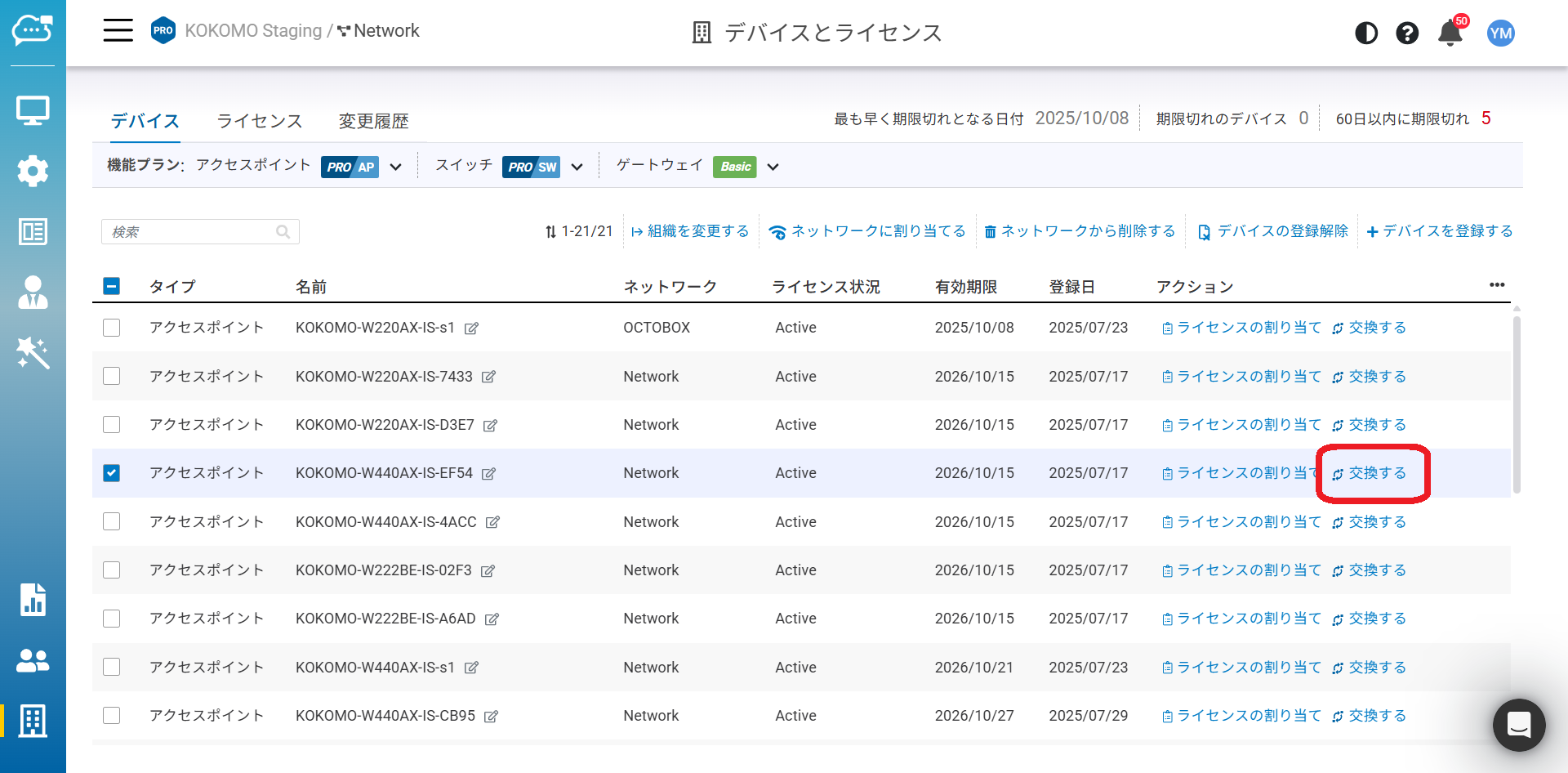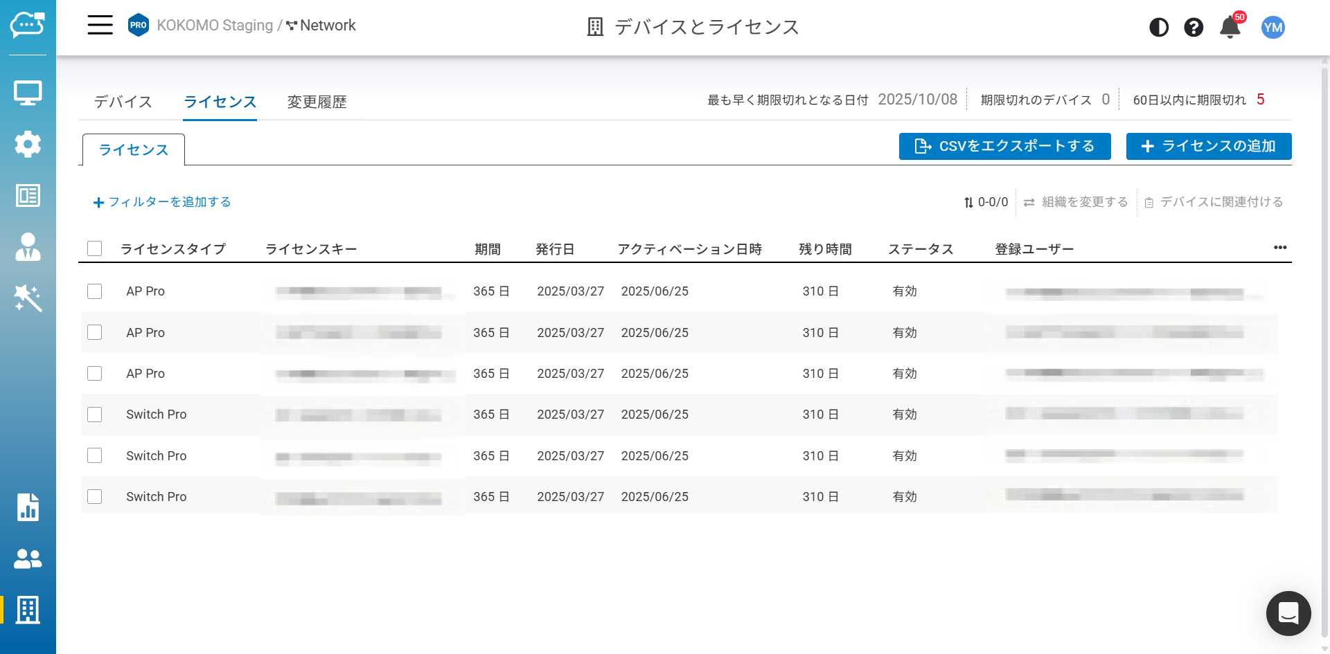 ライセンス状況:アクティブ、非アクティブ、マージ中、期限切れがあります。詳細はライセンスのセクションをご確認ください。