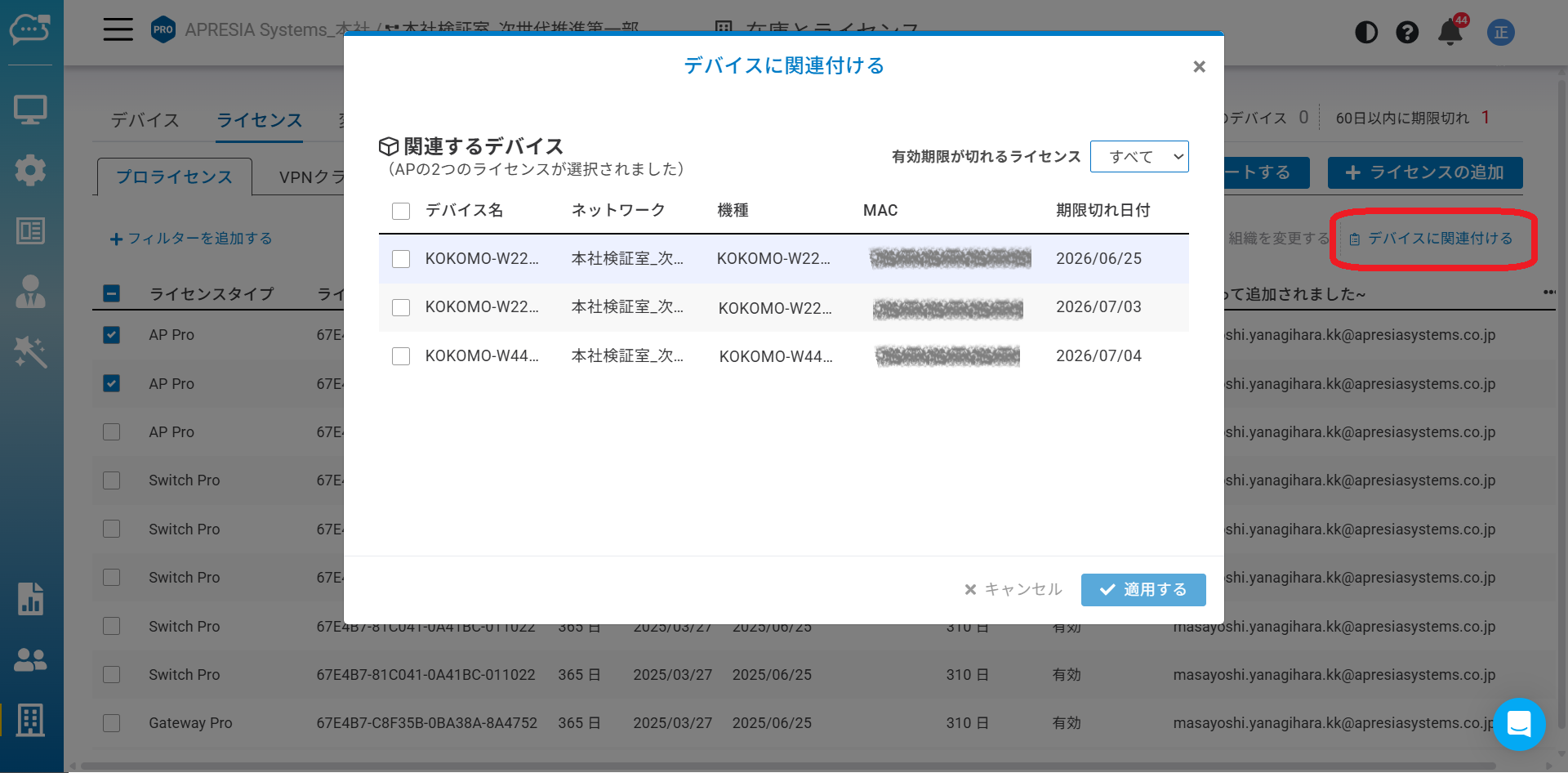 デバイスとライセンスの管理