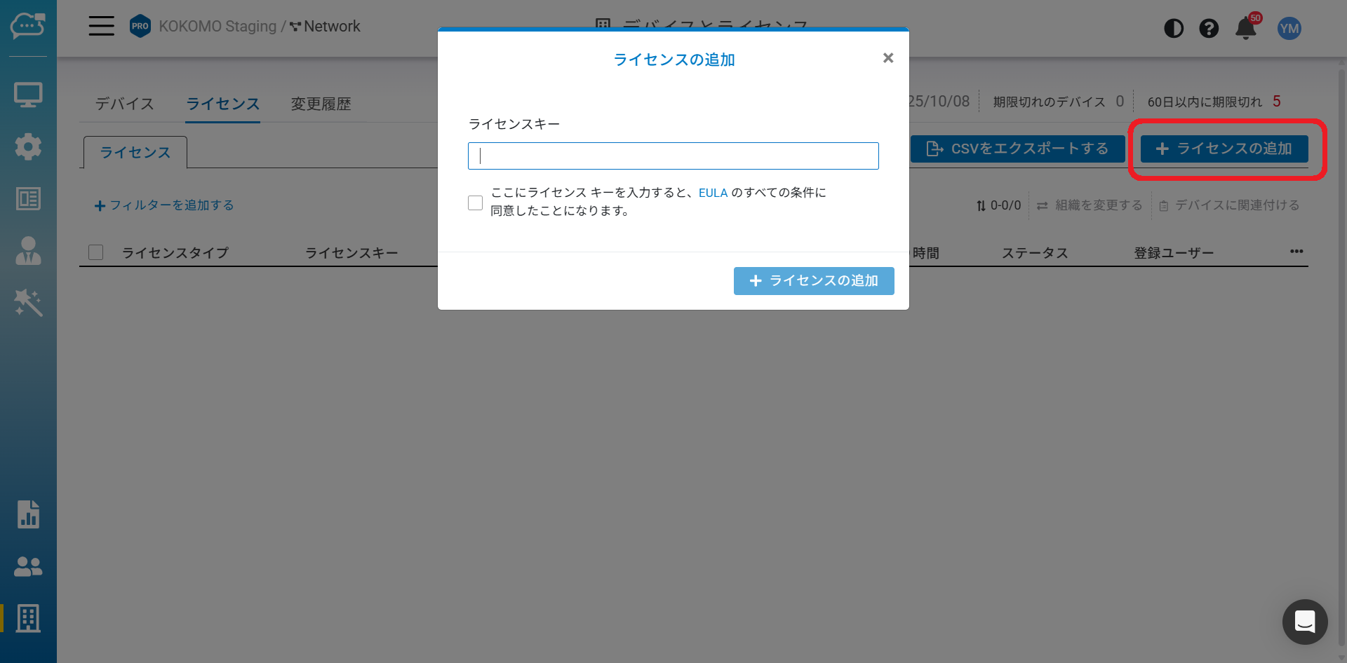 「組織」>「デバイスとライセンス」>「ライセンス」のページからライセンスキーを追加できます。
