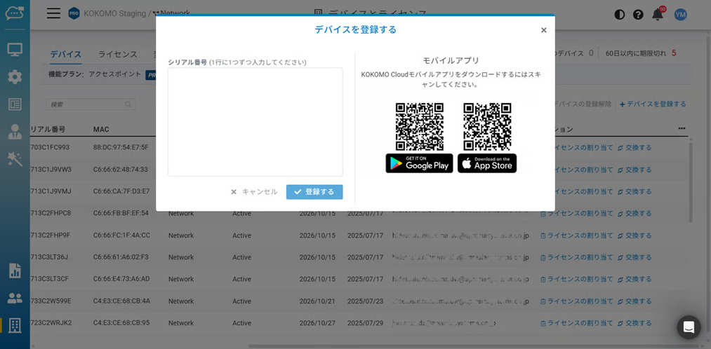 デバイスをKOKOMOクラウドに登録するのは簡単です。デバイスのシリアル番号を1行につき1台分入力し、「登録する」ボタンをクリックしてください。