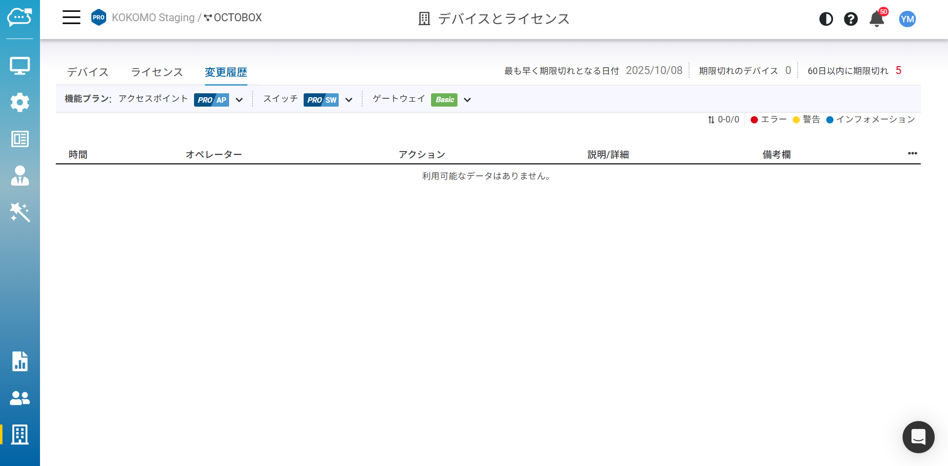 ライセンスに対するあらゆる変更を記録し、簡単に追跡できるようにするものです。 「組織」>「デバイスとライセンス」>「変更履歴」のタブでこのページにアクセスできます。