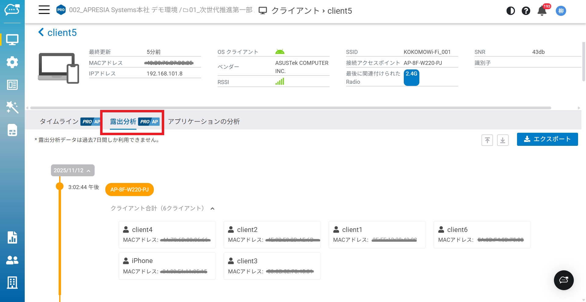 露出分析では、特定のクライアントに基づき、同じアクセスポイントに接続されたクライアントのリストとともにタイムラインを表示します。この機能を有効にすると、クライアントデータをタイムライン形式で取得して表示できます。