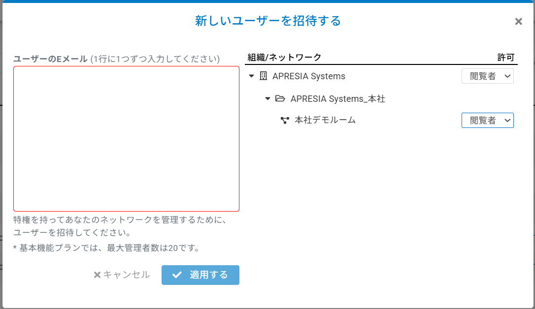 組織の権限が「閲覧者」の場合、「管理者」の権限が付与されているネットワークにのみ招待可能