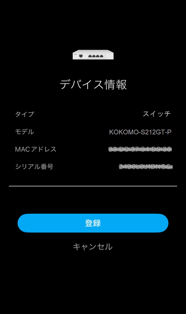 QRコードのスキャンに成功すると、アプリにデバイス情報が表示されます。「登録」をタップして登録を完了してください。