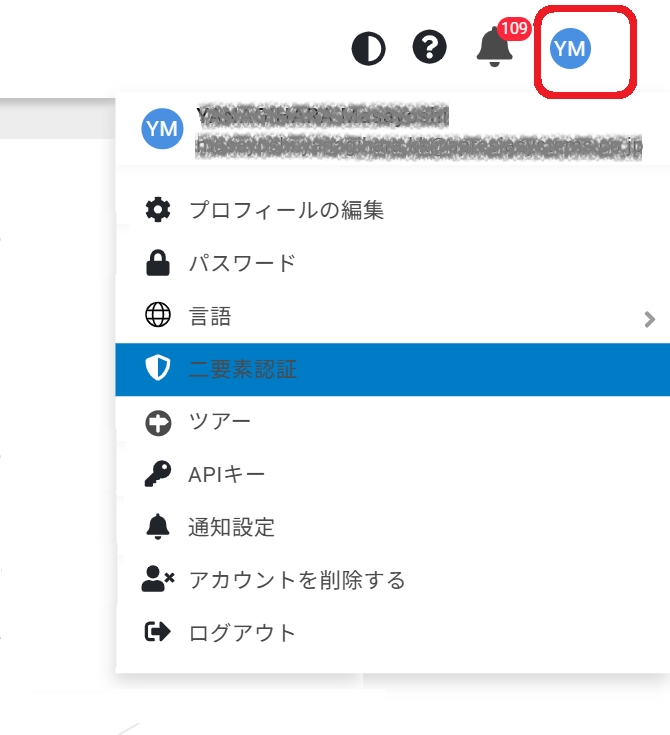 画面右上のメニューから「二要素認証」を選択します。