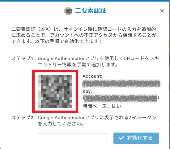 Google Authenticatorによって提供された6桁の認証トークンをポップアップに入力し、「有効化する」をクリックします。