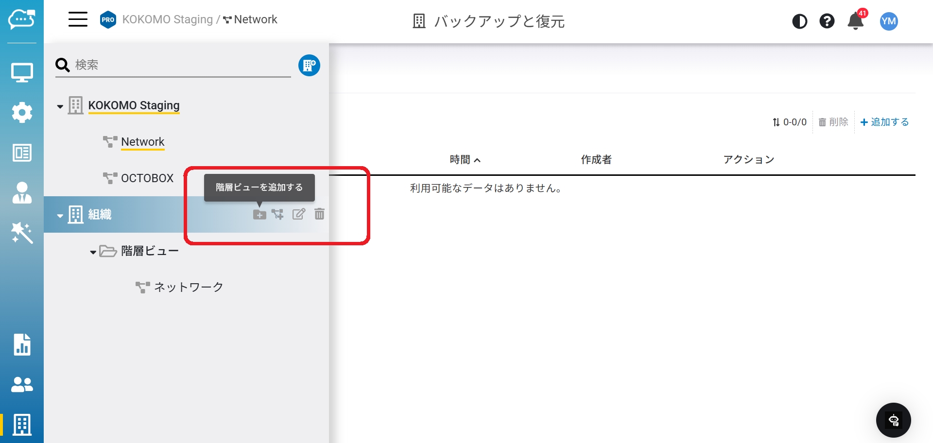 新規または既存の組織、あるいは既存の階層ビュー内にも階層ビューを作成できます。「メニュー」から組織または階層ビューを選択し、「階層ビューを追加する」をクリックします。