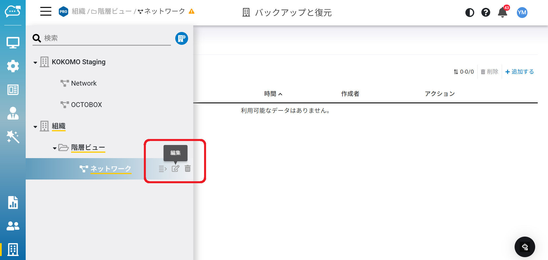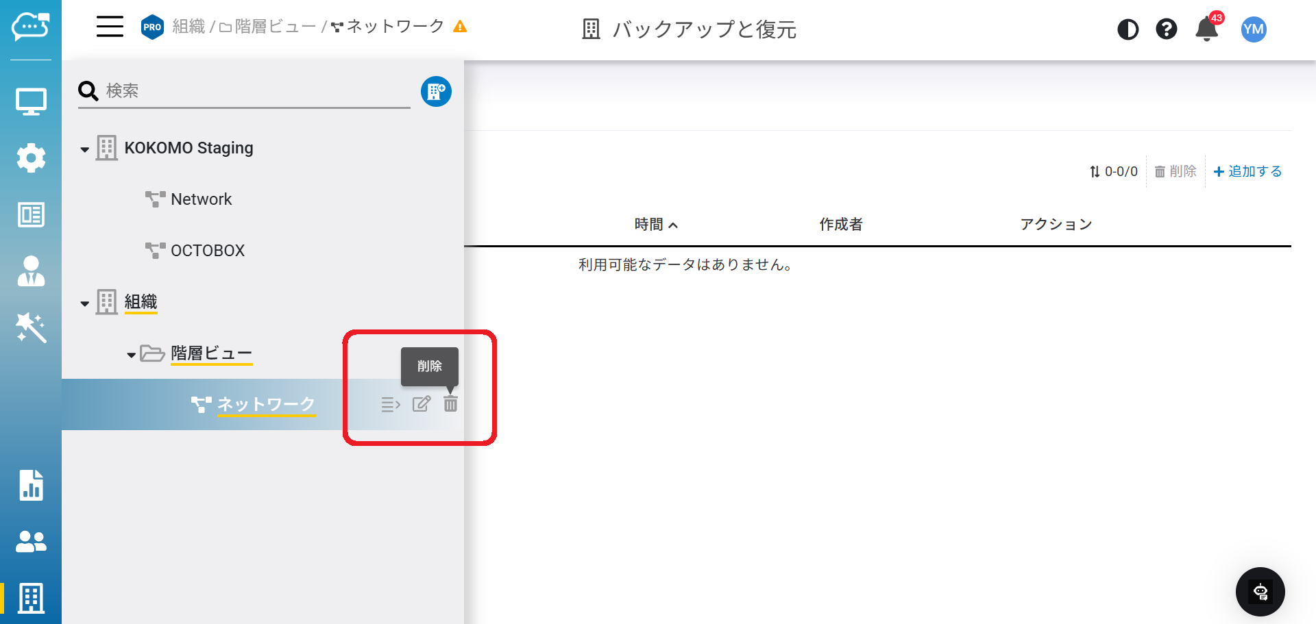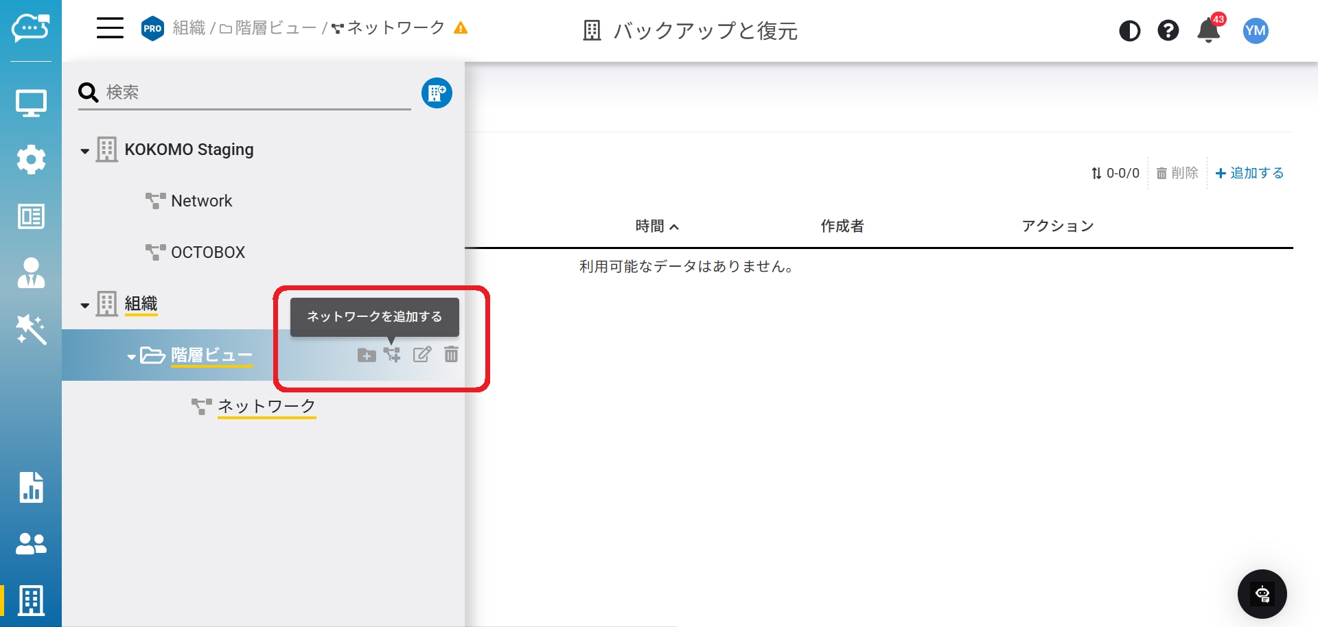 「メニュー」から組織または階層を選択し、「ネットワークを追加する」をクリックします。