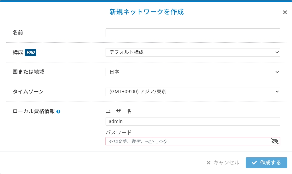 ネットワーク名を入力し、国とタイムゾーンを選択して、「作成する」をクリックします。バックアップもしくはNWテンプレートからクローンする場合は構成のプルダウンメニューから選択してください。